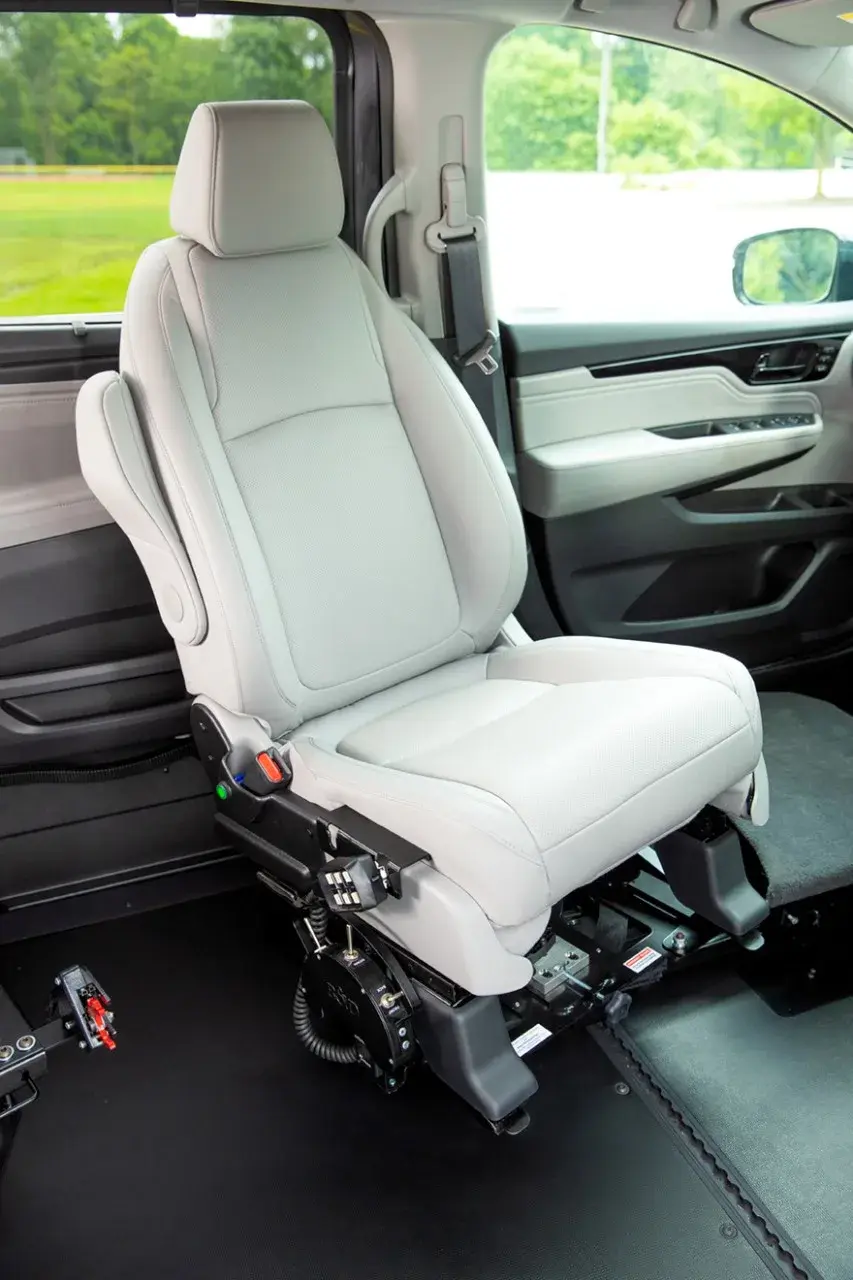 The BraunAbility Turny Evo is an advanced powered transfer seat designed to make entering and exiting a vehicle safe, smooth, and effortless. With the push of a button, the seat rotates out of the vehicle and lowers to a comfortable transfer height, allowing users to sit or transfer from a wheelchair completely outside the vehicle. Once seated, the system gently lifts and rotates the user back into position inside the vehicle.